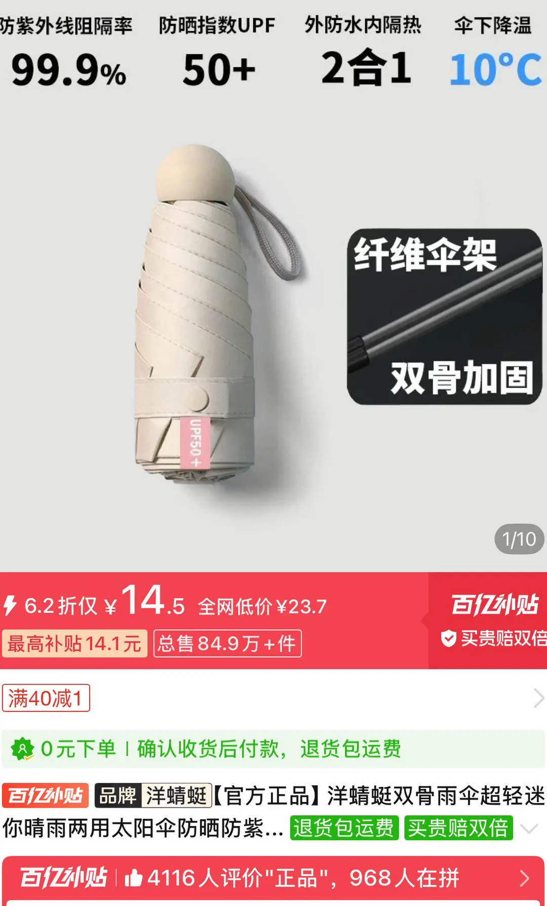 洋蜻蜓,是近两年靠着太阳伞在新电商品牌迅速崛起的工厂商家品牌,15元太阳伞是品牌的爆品。它在拼多多平台上有十家店铺,其中仅一家就已经拼了200多万件。品牌创始人方佳骏向记者介绍,洋蜻蜓的伞都有效阻隔紫外线大于99.99%的检测,从实用性上看完全能满足大众对于太阳伞的需求。为什么价格可以低至不到15元,他坦言,15元左右的伞,制作成本、物流成本加上人工等成本,约为9元多,扣除运营成本等,一把伞可以赚个2三块,在平台有补贴时,利润空间会更大。